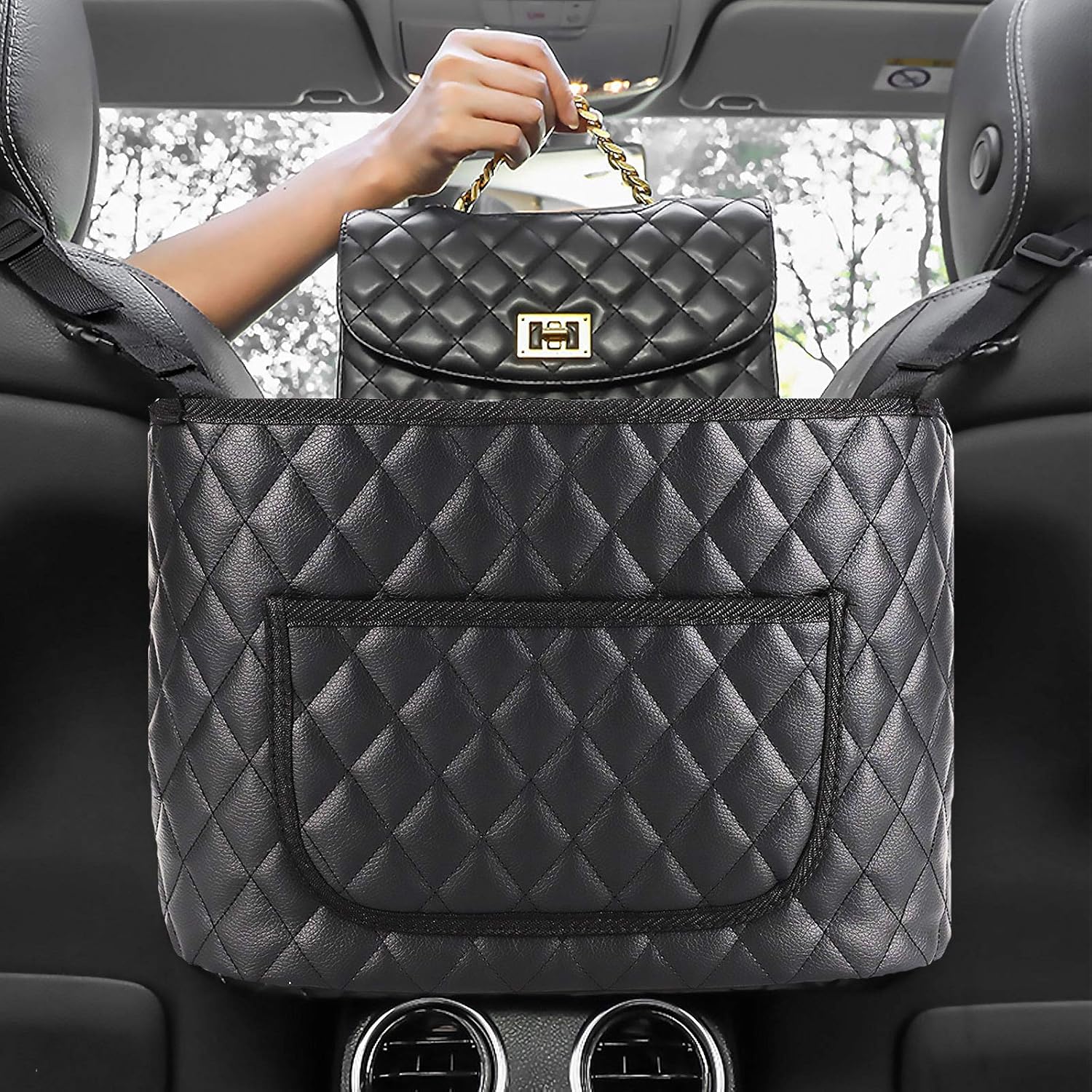 Car Net Pocket Handbag Holder,Purse Holder Storage for Drivers,Handbag Holder Front Seat Storage, PU Leather Seat Back Organizer with An Extra Rear Pocket, Barrier of Backseat Pet and Kids,Black