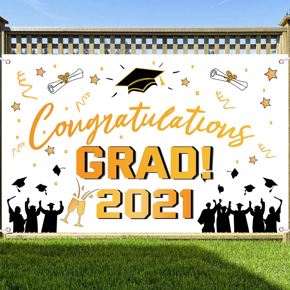 Graduation Banner Decorations 2021- Extra Large 73" X 45" Graduation Backdrop for Class of 2021, Graduation Party Supplies with Long String, Graduation Decorations Indoor or Outdoor- 🎓Large 2021 Graduation Decorations Banner Set: Package with a large size congratulations backdrop, measures approx 73x 45in, and the string measures approx 19.67ft. Extra large letters printed on graduation banner, “congratulations” “GRAD”, which can draw attention to highlighted areas, and create an atmosphere that speaks to the theme of the party.
