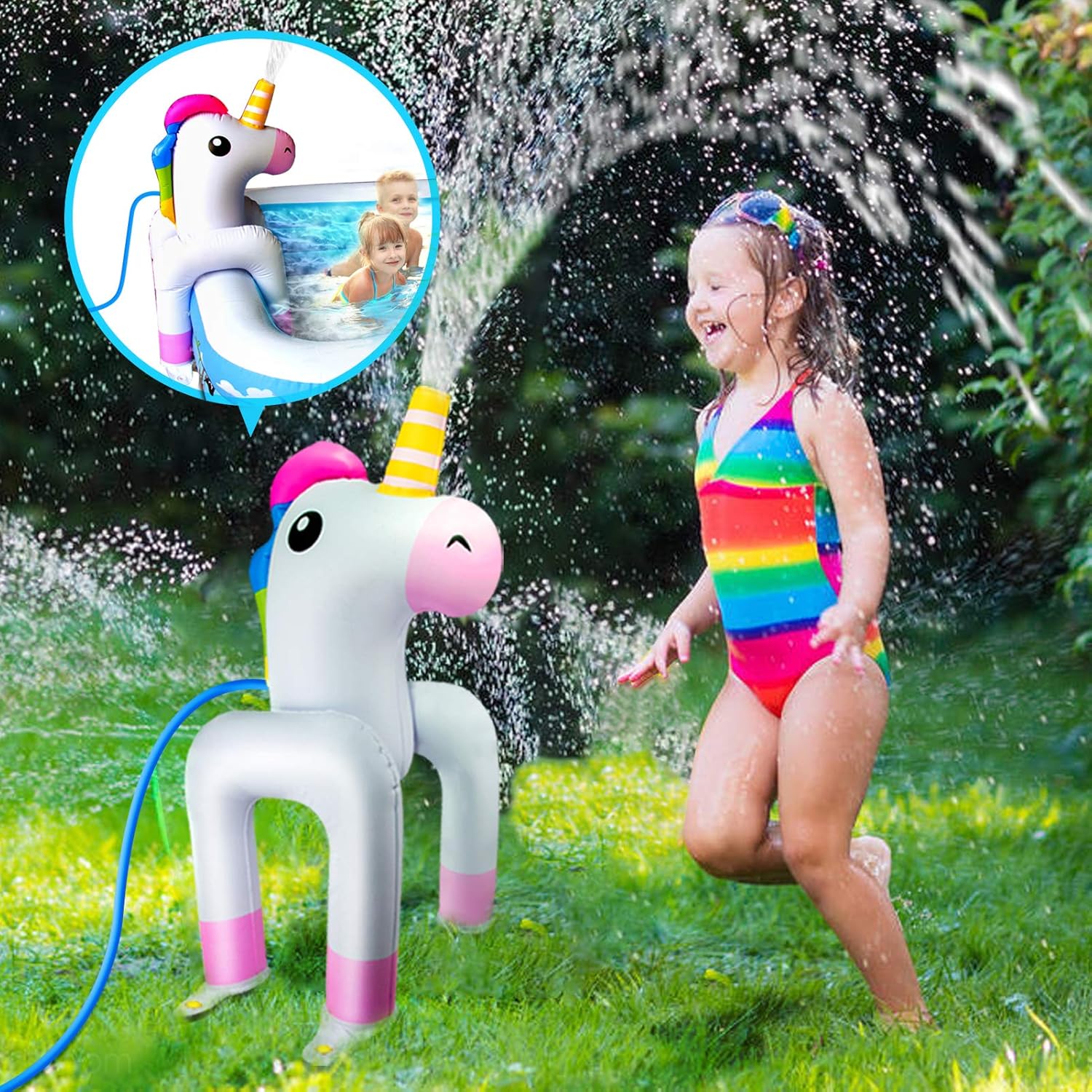 - 【Easy to Use】 Cool off on a hot summer day with this unicorn water sprinkler. It's easy to use and it fits all regular sized garden hoses. Simply inflate it, turn it on this water sprinkler for kids outdoor play which can sure to create big fun for your family and friends at your next outdoor party.
